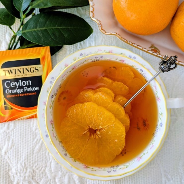 【写真】「こんな大胆な飲み方もしてみたい」トワイニングが伝授する“冬のみかんティー” 「今日は冬の定番果物の『みかん』を使ったアレンジティーをご紹介します」と呼びかけ、「レモンティーと似た柑橘系の爽やかな風味♪そして、みかんは温めると甘くなるので、紅茶に浸かったみかんもとても美味しいです。見た目もみかんのスライスがお花のようになり可愛いですよ」と紹介している。