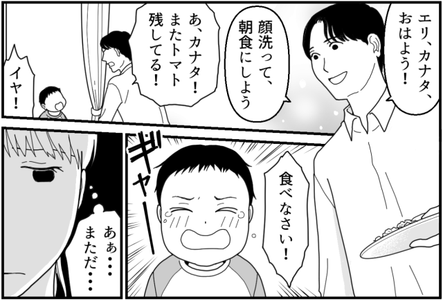 タクヤの言っていることは正論なのでしょう。けれど朝の忙しい時間帯、イヤイヤ期真っ盛りの2才児に求めるものが多すぎるのです。タクヤが出かけた後、大泣きしているカナタを必死になだめるうち時間がギリギリになります。