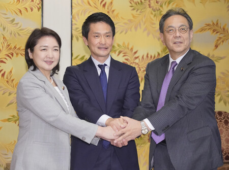 会談後に握手する中道改革連合の小川淳也代表(中央)、立憲民主党の水岡俊一代表(右)、公明党の竹谷とし子代表=17日午後、国会内 中道改革連合、立憲民主、公明3党は17日、国会内で党首会談を開き、18日の特別国会召集日に行われる首相指名選挙に関し、立公も中道の小川淳也代表に投票することで大筋合意した。立民の一部に異論が残るため、小川氏は「なお調整が残っている。結束できるよう最後まで努力を尽くしたい」と記者団に述べた。