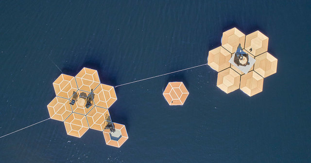 もう1つは、連結のしやすさだ。六角形はハチの巣のように、できるだけ隙間なく並べることができ、複数台を連結すれば水上に広い面をつくることも可能である。もちろん、四角形でも並べられるが、六角形のほうが外周が滑らかで(角が少なく、全体の輪郭が丸みに近い)、波の力を分散しやすい。