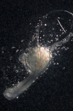 理化学研究所とオーガンテック社の研究チームが実験容器内で再生させたマウスの毛の器官「毛包」(写真中央から右上に伸びているのが毛)。人工皮膚への移植で生え替わりまで完全に再現した(同社提供) 皮膚で毛髪を生み出す器官「毛包」を実験容器内で完全に再現するのに必要な第3の細胞を成体マウスで発見したと、理化学研究所とベンチャー企業「オーガンテック」(東京都中央区)の研究チームが25日発表した。この「毛包再生支持細胞」はヒトの大人にもあり、脱毛症の新治療法の開発が進むと期待される。