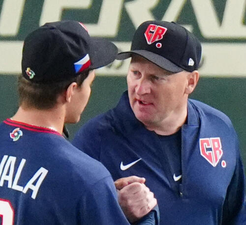 韓国対チェコ 5回の登板を終えたチェコのコバラ(左)を出迎えるハジム監督(2026年3月5日撮影)