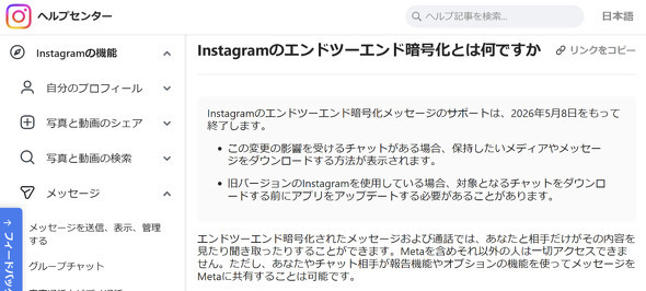 米Metaは、「Instagram」のエンドツーエンド暗号化(E2EE)機能を5月8日に終了する。3月9日(現地時間)に、過去の公式ブログの更新という形で告知しており、米The Vergeなど複数のメディアが14日に報じた。