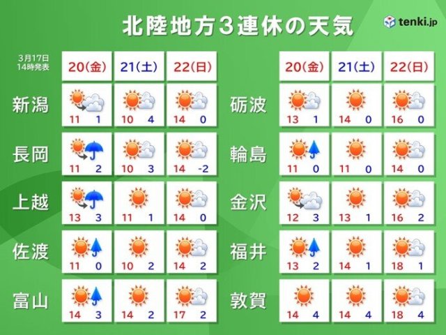 北陸地方今週末の3連休の天気は概ね晴れますが、20日(金)は寒気の影響で平地はにわか雨、山は冬に戻りますので注意が必要です。3連休が過ぎれば春本番となりそうです。