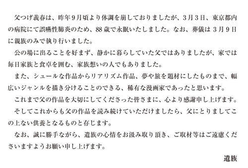 父つげ義春は、昨年9月頃より体調を崩しておりましたが、3月3日、東京都内の病院にて誤性肺炎のため、88歳で永眠いたしました。なお、葬儀は3月9日に親族のみで執り行いました。