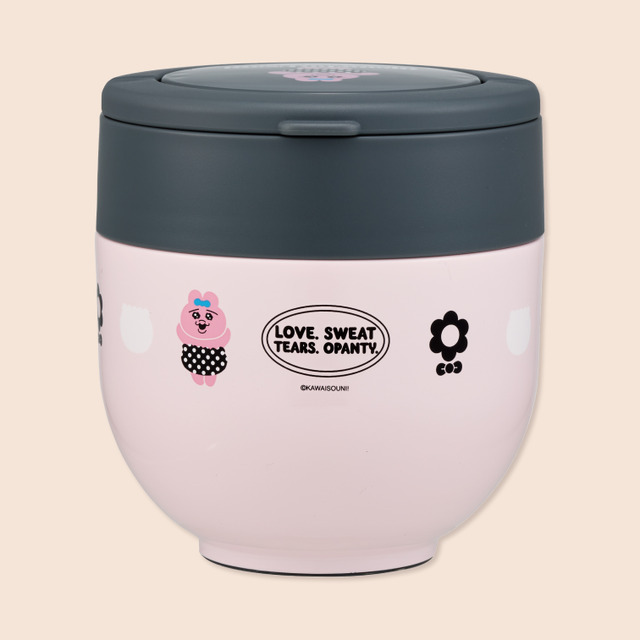 「デリカポット」は、スープ、カレー、シチューなどの汁物から、冷たいサラダやフルーツまで幅広く使える。容量はたっぷり入る500ml。アイボリーと赤を基調に、サクランボや「おぱんちゅうさぎ」のイラストをあしらった、レトロでポップなデザインがランチタイムを明るく彩る。