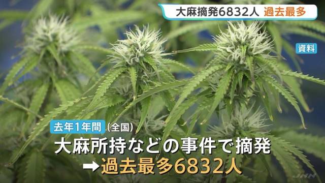 警察庁によりますと、去年1年間に全国で大麻の所持や使用などの事件で摘発された人数は、前の年よりも754人増えて6832人に上り、過去最多となりました。