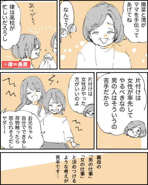 義母は、とかく「男の仕事」「女の仕事」と決めつけたがり、いわゆる“ジェンダーバイアス”があるのだそう。悪気はないのでしょうけれど、「男性はこうあるべき」「女性はこうあるべき」といった固定観念はそろそろやめてほしいもの。個人を大事にする時代です。性別の壁なんて取っ払って、自分のことは自分でやる、できないことは助け合う。ただそれだけでいいんですが、理解し合うのは難しいかもしれませんね。