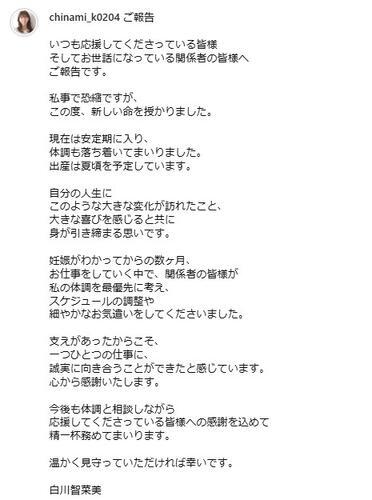 「ご報告です。私事で恐縮ですが、この度、新しい命を授かりました。現在は安定期に入り、体調も落ち着いてまいりました。出産は夏頃を予定しています」と発表した。白川は23年に結婚を発表。その後、活動名を「川又智菜美」から「白川智菜美」に改名。