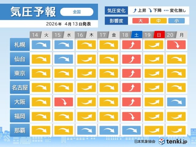 ÌÀÆü¤ÏÁ´¹ñŪ¤Ëµ¤°µ¤¬²¼¤¬¤ê¡¢ÅìË̤«¤é²Æì¤Ç±Æ¶Á¤¬¡ÖÃæ¡×¤È¤Ê¤Ã¤Æ¤¤¤Þ¤¹¡£ÌÀ¸åÆü15Æü(¿å)¤ÏÄ㵤°µ¤¬Ëܽ£ÉÕ¶á¤ò¿Ê¤à¤¿¤á¡¢Âçºå¤Çµ¤°µ¤Î²¼¹ß¤Ë¤è¤ë±Æ¶Á¤¬Â礤¯¤Ê¤ë¤Ç¤·¤ç¤¦¡£´ØÅì¡Á¶å½£¡¢²Æì¤â±Æ¶ÁÅÙ¤¬¡ÖÃæ¡×¤ÎͽÁۤǡ¢Ãí°Õ¤¬É¬ÍפǤ¹¡£16Æü(ÌÚ)°Ê¹ß¤Ï¹âµ¤°µ¤Ëʤ¤ï¤ì¤ëÆü¤¬Â¿¤¯¡¢ÆÃ¤Ë18Æü(ÅÚ)¤Ï»¥ËÚ¤«¤éÂçºå¤Ç¾å¾º¤Î±Æ¶ÁÅÙ¤¬Â礤¤Í½ÁۤǤ¹¡£Ê¡²¬¤Ï²¼¹ß¤Î±Æ¶ÁÅÙ¤¬Â礤¯¤Ê¤ë¤Ç¤·¤ç¤¦¡£µ¤°µ¤ÎµÞ¤ÊÊѲ½¤ÇÂÎÄ´¤òÊø¤·¤ä¤¹¤¤Êý¤Ï¡¢»öÁ°¤Ë¾¯¤·¤Ç¤âÂкö¤ò¤·¤Æ¤ª¤¯¤È°Â¿´¤Ç¤¹¡£
