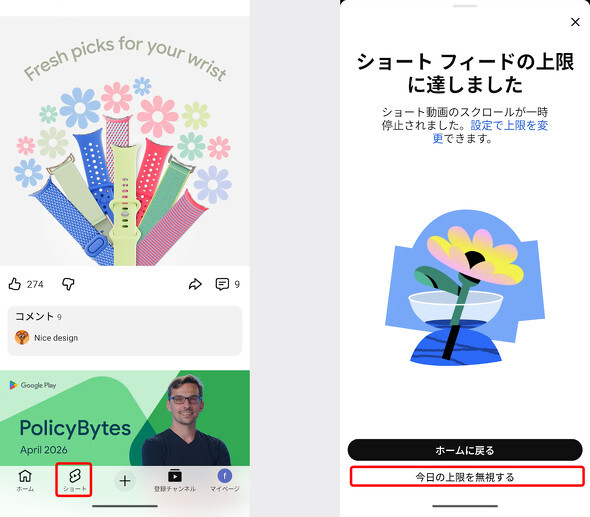 「ショート」タブをタップすると「ショートフィードの上限に達しました」と表示されるが、「今日の上限を無視する」ことができる 「YouTube」アプリで、ショート動画の再生時間を0分(つまり実質的な視聴制限)に設定できるようになった。米The Vergeなどの米メディアが4月15日(現地時間)に報じた。
