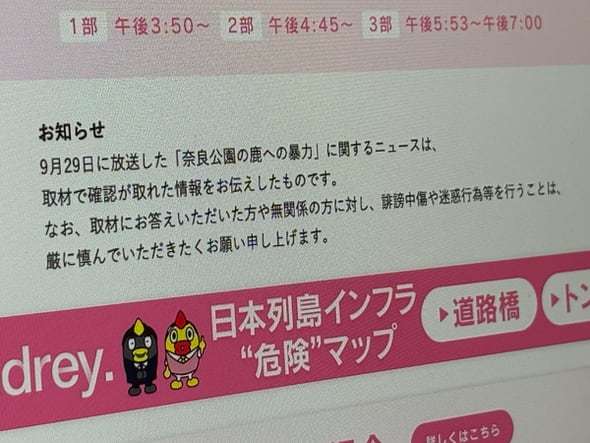 日本テレビは10月2日、報道番組「news every.」で9月29日に放送した奈良公園のシカを巡るニュースについて、「取材で確認が取れた情報をお伝えしたもの」とする声明を発表した。番組放送直後からネット上では内容を疑問視する声が上がっており、反論とみられる。