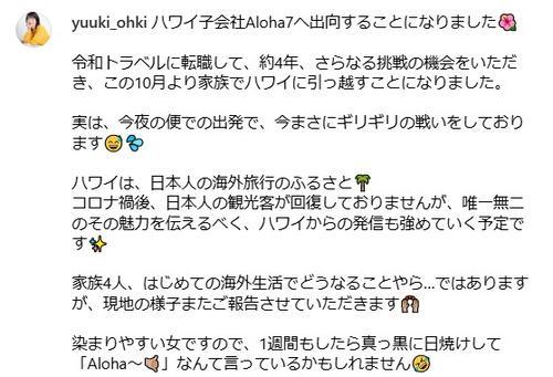 大木氏は21年末にテレ朝を退社した大木さんは現在、旅行会社「令和トラベル」に転職。「ハワイ子会社Aloha7へ出向することになりました 令和トラベルに転職して、約4年、さらなる挑戦の機会をいただき、この10月より家族でハワイに引っ越すことになりました」と発表した。