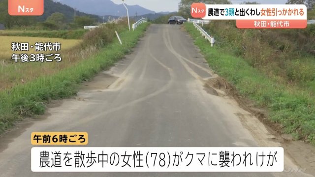 きょう午前6時ごろ、秋田県能代市の農道で、散歩をしていた78歳の女性がクマに襲われました。クマは3頭いて、このうち成獣とみられる体長およそ1メートルの1頭が女性の背中を引っかいたということです。