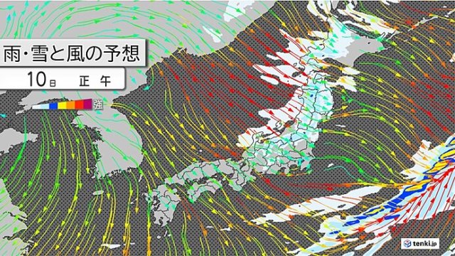今日10日は次第に西高東低の気圧配置に変わり、全国的に風が強まるでしょう。また、上空約5500メートル付近で、北日本ではマイナス30℃以下、東日本ではマイナス21℃以下と、この時期としては強い寒気が流れ込む予想です。日本海側を中心に雨雲や雪雲が発達しやすくなるため、落雷や竜巻などの激しい突風、ひょうなどにご注意ください。