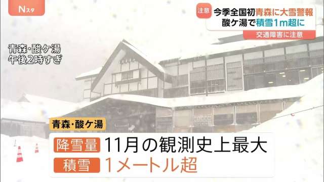 青森県では各地で雪が降り続き、今シーズン全国初となる大雪警報が出されました。酸ケ湯では記録的な大雪で、積雪が1メートルを超えました。