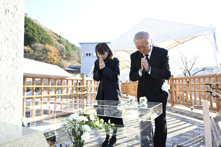 笹子トンネル事故の発生から13年を迎え、慰霊碑に献花する遺族ら=2日午前、山梨県大月市(代表撮影)