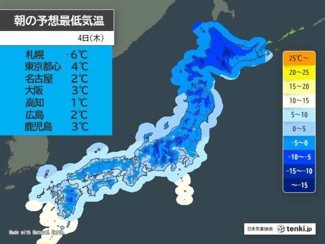 強烈な寒気の影響で、明日(4日)の朝にかけては、全国的に今シーズン一番の冷え込みとなりそうです。札幌は氷点下6℃。関東から九州にかけての市街地でも3℃前後まで下がる所が多く、東京都心は今季初めて5℃を下回りそうです。冷たい北寄りの風も吹いて、震える寒さになりそうです。通勤、通学の際はダウンコートにマフラーなど防寒対策は万全にしてお出かけください。