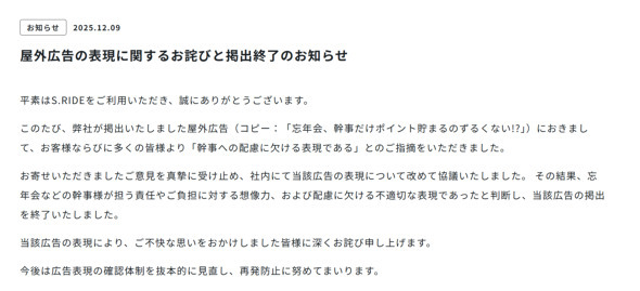 タクシー配車アプリ「S.RIDE」運営元は12月9日、「忘年会、幹事だけポイント貯まるのずるくない!?」というコピーを使った広告について、「幹事への配慮に欠ける不適切な表現だった」として、掲出を終了したと発表した。
