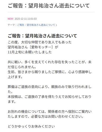 公式ブログでは「この度、大切な仲間であり友人でもあった望月祐治さん[愛称モッチー]が11月上旬に永眠いたしました」と報告。「共に戦い、多くを支えてくれた存在を失ったことが、未だ信じられません。生前、皆さまから賜りましたご厚情に、心より感謝申し上げます」とつづった。