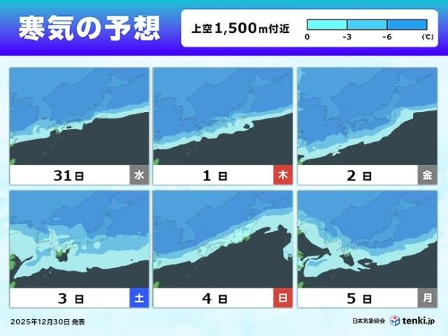 ただ、上空(1500メートル付近)の寒気の予想を見ると、明日31日は北からマイナス6℃以下という強い寒気が次第に北日本や日本海側にかかり、新年1日〜2日かけては関東から九州南部にかけての太平洋側まで覆われる見込みです。その後、少なくとも5日までは本州付近に居座りそうです。
