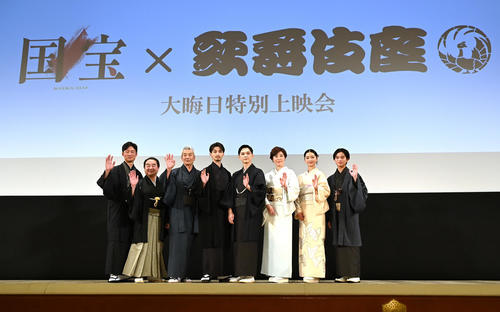 映画「国宝」歌舞伎座大みそか特別上映会で舞台あいさつを行う左から李相日監督、中村鴈治郎、田中泯、横浜流星、吉沢亮、寺島しのぶ、見上愛、黒川想矢(2025年12月撮影)