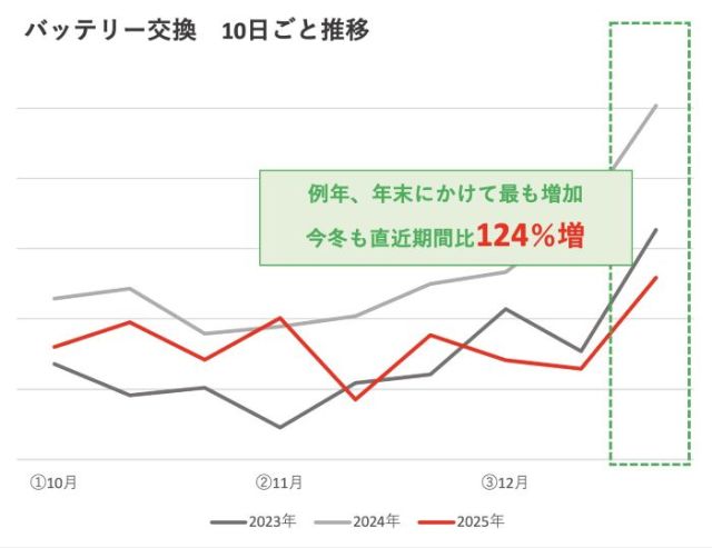 寒い場所でバッテリー消費が激しいと感じることはよくある。“何はなくてもスマホ”という時代、出先で残量表示が低レベルになったり、“ご臨終”となってしまったりするのは避けたいところ。デジタル機器の設定・トラブル解決を行う日本PCサービス(大阪府吹田市)が、2025年12月までのスマホのトラブル相談状況を公開した。それによると、寒暖差の激しいこの冬のバッテリー劣化による相談は、直近の期間と比べて124%に増えているといい、同社は冬のスマホの取り扱いについて注意を呼び掛けている。
