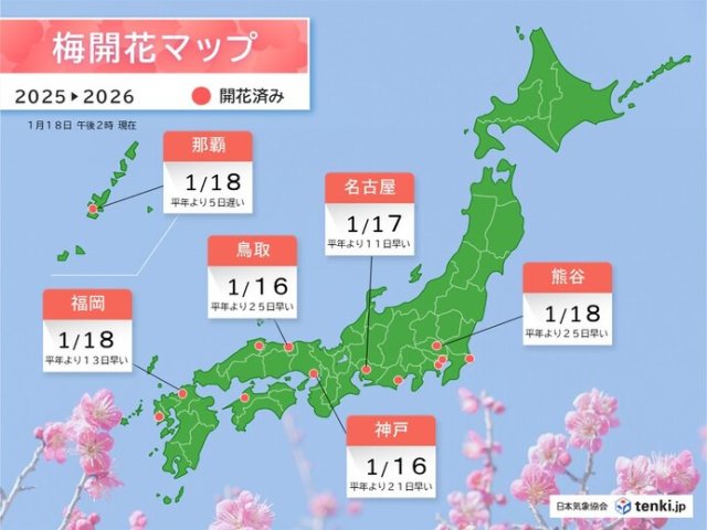 ここ数日は、関東から西の地域で春の陽気が続いており、梅の開花の便りが続々と届いています。おととい16日は、神戸と鳥取で梅(ハクバイ)の開花が発表され、昨日17日は名古屋、今日18日は、熊谷、福岡、那覇でも梅(ハクバイ)の開花が発表されました。那覇は平年より5日遅い開花となりましたが、熊谷と鳥取では平年より25日も早く、平年より大幅に早く開花した所が多くなっています。