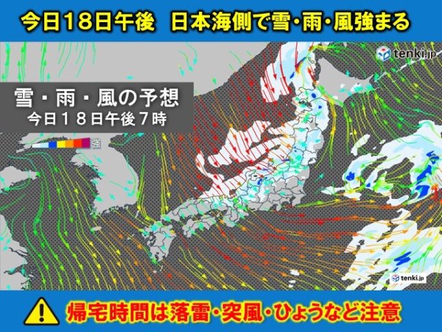 今日18日午後は日本海側から荒天 雪・雨・風強まる