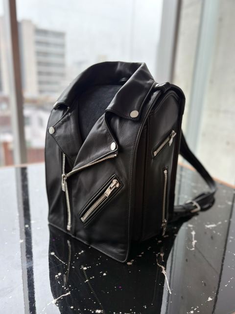 サイズは、普段使いを考慮して14インチのラップトップまで収納可能。ライダース部分は実際のライダースジャケットのようにボタンを留めることで襟元のデザインを変えて楽しむことができる。内側には、エーレザーのロゴをあしらった。価格は33万円。