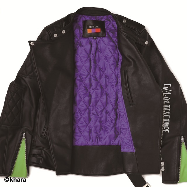 ライナーと袖口のレザーには初号機を想起させるカラーを忍ばせ、背面には「汎用ヒト型決戦兵器 人造人間エヴァンゲリオン初号機」の文字が手書き風タイポグラフィーで大胆にプリントされた。