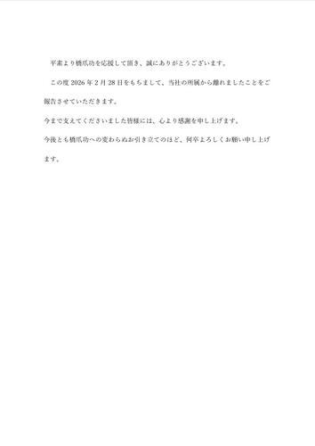 この度2026年2月28日をもちまして、当社の所属から離れましたことをご報告させていただきます。 今まで支えてくださいました皆様には、心より感謝を申し上げます。