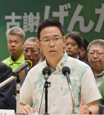 古謝氏は会見で「責任ある立場でこの島のあすをつくっていく覚悟だ」と述べた。米軍普天間飛行場(宜野湾市)の名護市辺野古移設について「容認」の立場を取ると明言した。