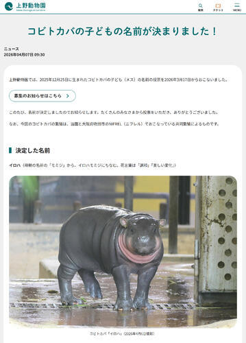 上野動物園が昨年12月誕生、コビトカバの子どもの命名を発表「絶滅危惧種」で世界三大珍獣