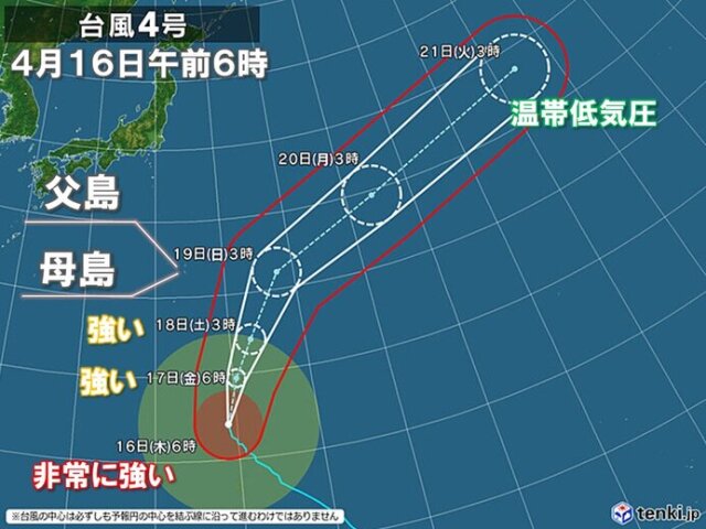 台風4号は東寄りに進むため、小笠原諸島が暴風域に入る可能性は低いですが、小笠原諸島では海上では大しけとなり、強い風が吹くでしょう。17日(金)から18日(土)にかけて高波に警戒し、強風に注意が必要です。