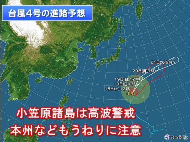 このあと台風4号は、さらに小笠原近海を北上し、明日19日には次第に向きを東へ変え、南鳥島近海を進む見込みです。その後、21日(火)にはウェーク島近海へ進み、温帯低気圧に変わるでしょう。
