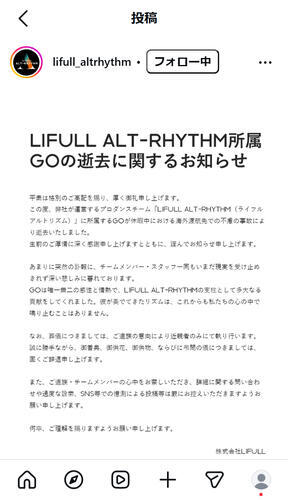 インスタグラムでは「この度、弊社が運営するプロダンスチーム『LIFULL ALT−RHYTHM(ライフルアルトリズム)』に所属するGOが休暇中における海外渡航先での不慮の事故により逝去いたしました」と報告。「あまりに突然の訃報に、チームメンバー・スタッフ一同もいまだ現実を受け止めきれず深い悲しみに暮れております」と伝え、「GOは唯一無二の感性と情熱で、LIFULL ALT−RHYTHMの支柱として多大なる貢献をしてくれました。彼が奏でてきたリズムは、これからも私たちの心の中で鳴り止むことはありません」としのんだ。
