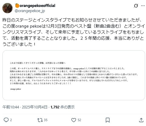 「昨日のステージとインスタライブでもお知らせさせていただきましたが、この度orange pekoeは12月3日発売のベスト盤(新曲2曲含む)とオンラインクリスマスライブ、そして来年に予定しているラストライブをもちまして、活動を満了することとなりました。25年間の応援、本当にありがとうございました!」と感謝。
