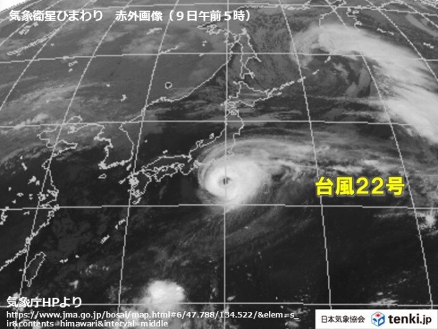 台風22号は、今日9日朝にかけて伊豆諸島に最も近づく予想。午前4時現在も「非常に強い」勢力で、発達のピーク。利島村、新島村、神津島村、三宅村、御蔵島村、八丈町、青ヶ島村に暴風と波浪の特別警報が発表中。暴風やうねりと伴った高波に最大級の警戒を。