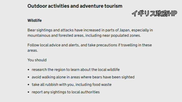 イギリス政府は、ホームページの日本に関する安全情報ページで「クマの目撃や被害が山岳地帯や森林地帯に加え、人口密集地の近くでも増加している」と指摘し、注意を呼びかけました。