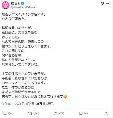 「最近リポストメインの桂です。ひとつご報告を」と前置きした上で「詳細は言いませんが、私は最近、大きな手術を致しました。なので当分の間、静養しつつ 緩やかにリピリピをしていきます」と明かした。