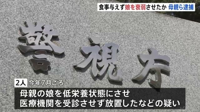 娘に食事を十分に与えず、自力で歩くのが困難になるほど衰弱させたなどとして、30代の母親と交際相手の20代の男が逮捕されました。