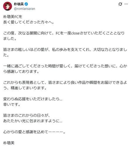 ファンクラブ公式サイトで「この度、Romi Park Official Fan Clubは2025年12月26日(金)昼12:00をもちましてサービスを終了することとなりました」と発表され、朴は「朴璐美FCを長く愛してくださった方々へ。この度、次なる展開に向けて、FCを一度closeさせていただくこととなりました」と報告した。