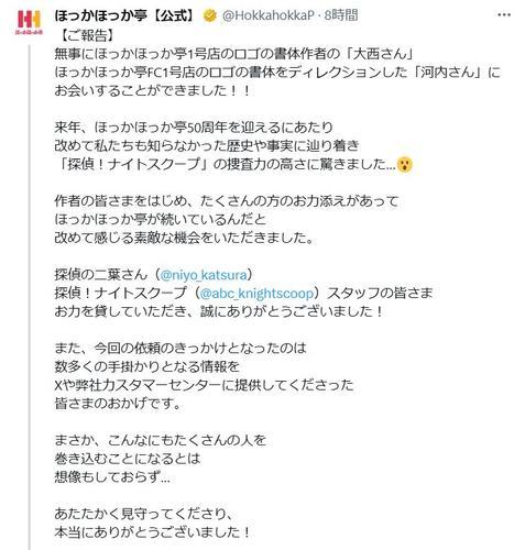 「ほっかほっか亭」の公式Xは「探偵! ナイトスクープ」が放送された21日夜に「【ご報告】無事にほっかほっか亭1号店のロゴの書体作者の『大西さん』ほっかほっか亭FC1号店のロゴの書体をディレクションした『河内さん』にお会いすることができました!!」と報告。「のりべん」と書かれた書を手にした2人の男性の写真を投稿した。