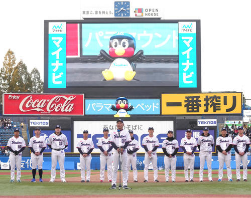 ヤクルト池山隆寛監督(59)が活動を休止している「つば九郎」の来季の活動再開を明言した。23日、神宮で行われたファン感謝デーでの最後のあいさつ。「本日はたくさんのご来場ありがとうございました。あらためてただいまです。神宮に降臨」とおどけた。スローガンの公募を発表し、「最後にもう1つ」とサプライズ発表を続けた。「来シーズンから彼が戻ってきます」とビジョンにつば九郎が映った。球場にどよめきが起こり、池山監督は「彼と一緒にみなさんとともに応援してもらい、選手の躍動をよろしくお願いします」と話した。