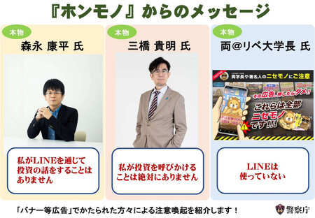 警察庁は対策として、名前を悪用された本人に協力を依頼。経済アナリストの森永康平氏の「私がLINEを通じて投資の話をすることはありません」、経済評論家の三橋貴明氏の「私が投資を呼びかけることは絶対にありません」など、承諾を得た3人のメッセージを公式Xに掲載した。広報啓発に生かすほか、本人の関連サイトでも発信してもらう。