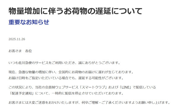 佐川急便は11月26日、「急激な物量増加」により全国的に荷物の配達遅延が生じており、配達日時を指定した荷物も遅れる可能性があると発表した。