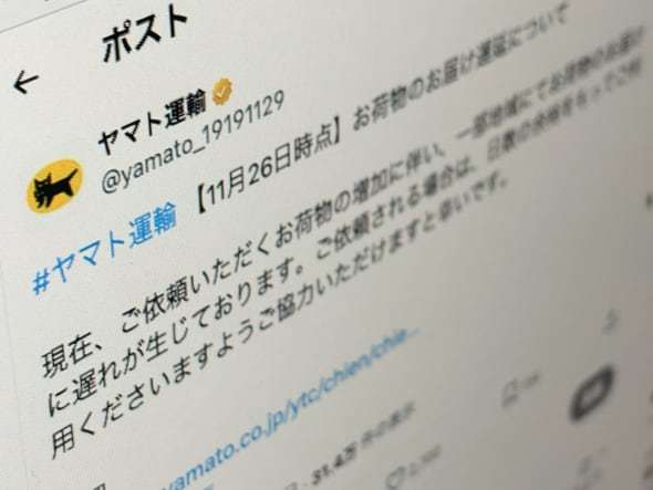 ヤマト運輸は11月26日、「荷物の増加」により一部地域で配達に遅れが生じていると発表した。公式Xアカウントで、荷物は「日数の余裕をもって」依頼してほしいと呼びかけている。