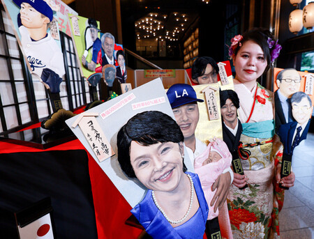 今年話題になった人物を描いた恒例の「変わり羽子板」が3日、東京都台東区の人形専門店「久月」本社で披露された。米大リーグで今季最優秀選手(MVP)に3年連続で選ばれた大谷翔平選手や、日本で女性初の首相に就任した高市早苗氏ら12人がお目見えした。