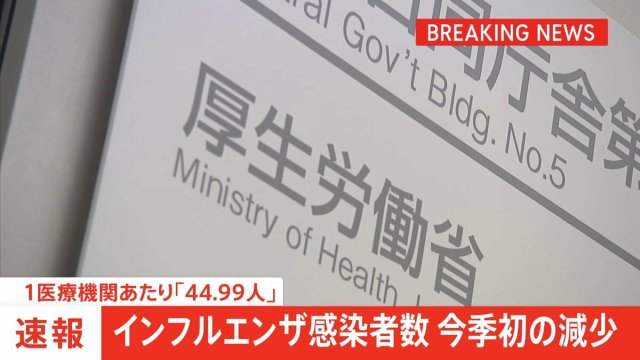 全国で1週間に報告されたインフルエンザの感染者数は、今シーズンで初めて減少し、「44.99人」でした。